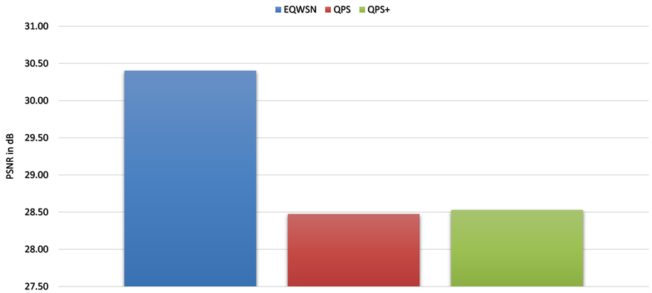 Figure 3 shows that EQWSN gives better video quality of 30.40 dB than other schemes as it depends on communicated packet type that allow higher priority frames such as I-Frame to be kept without dropping in case of congestion and routed through more reliable paths in addition adaptively uses suitable encoding parameters according to current wireless channel. While other Schemes QPS, QPS+ show similar PSNR of 28 dB, where their queue scheduling does not keep high priority packets in case of congestion, in addition EQWSN reduces energy usage of the network so that more packets can be transmitted.