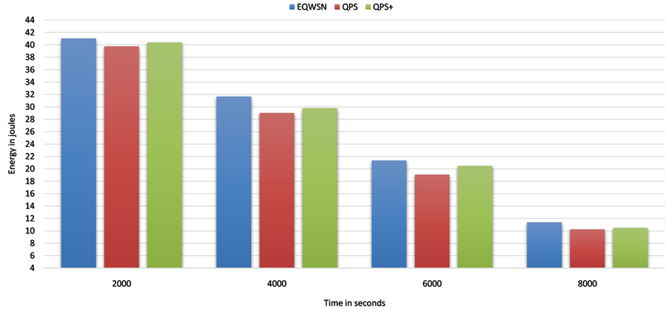 EQWSN not only maximized network lifetime by choosing paths with higher remaining energy, but also used energy fairly through the network by choosing paths with lower energy consumption. It is shown in Figure 6 that EQWSN and QPS+ schemes recorded better energy usage value 24.02 and 23.77 joules through simulation time, while QPS scheme is 23.72 joules as it only seeks to select paths, which has better reserve of energy. while EQWSN and QPS+ select paths with low cost of power consumption as explained earlier, in addition selecting paths with better reserve of energy in case network reach critical threshold energy value.