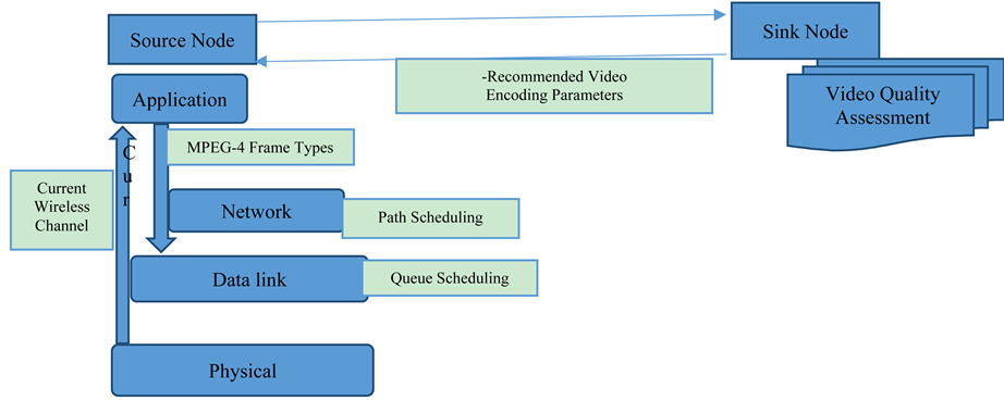 It uses cross-layer communication between Application, Network, Datalink and Physical layer as shown in Figure 1. At application, layer MPEG-4 encoder adjusts encoding parameters according to current wireless channel status, which is communicated from physical layer and recommendation from sink node [13] . Moreover,