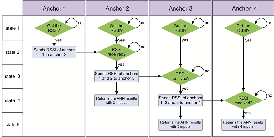simplicity, we associate a token to identify the beginning anchor in the process. In an ideal case, the first anchor node sends its RSSI to the second anchor node, and the second anchor sends its RSSI and the RSSI of the first anchor to the third anchor. The third anchor sends the three RSSI to the fourth anchor.