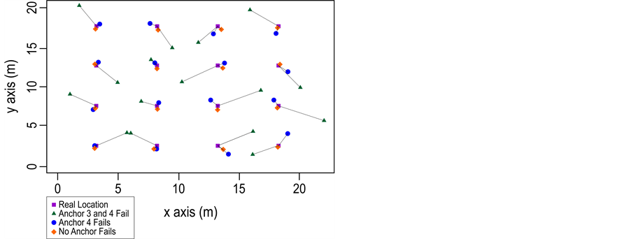 The function f in Equation (2) represents the RMSE considering anchor failures from Table 2. The constant 1.25 is the discretization RMSE generated in the free parameters due to binary representation. Figure 3 shows some location points estimated in the region of 20 × 22 m, considering no failures and anchor’s failure for the related cases.