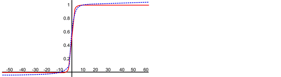 Figure 1. Relation between the continuous Log Sigmoid (in red) and the Elliott (in blue) functions.