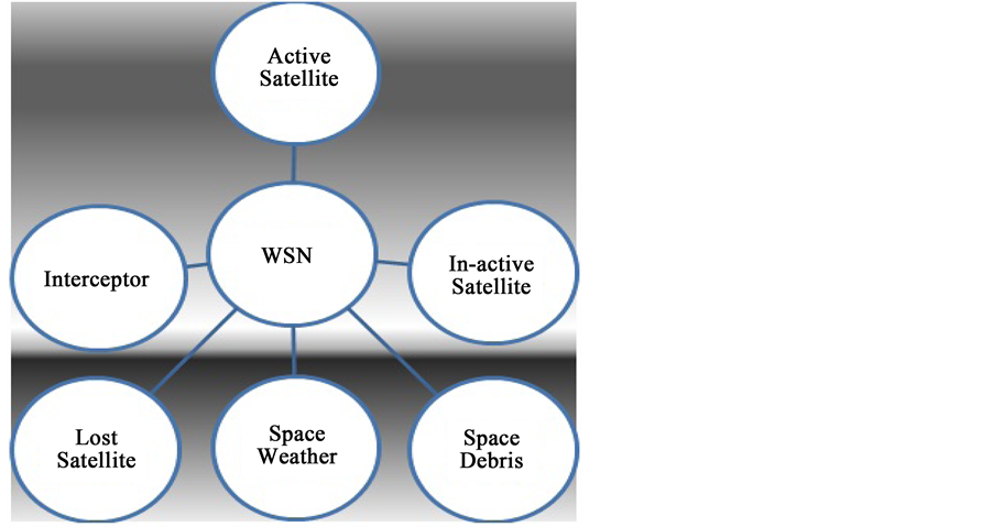 modifications required in traditional WSN. An advantage of WSN over the parasitic and monitoring satellite is that typical satellite needs explosion or deterioration after the life spans, which increase the fragmentation debris and can be harmful for other satellites in the same orbit. WSN requires no such type explosion. ASAT weapons and interceptors are major threats for the developed and satellite dependent countries; WSN is an effective system to tackle such type of problems. In future, after the required modification and hardware optimization in the nodes WSN-Satellite system would be economical, effective and debris free system for the space missions and surveillance.