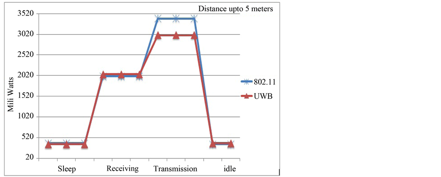 concerned about the energy efficient WSN, the UWB has the characteristics of energy efficiency. We conduct the simulated experiment in a network and calculate the utilization of energy separately at various standards (Wi-Fi, Bluetooth and UWB) and other parameters are mentioned in Table 2. For simulation 20 nodes are randomly deployed ranging from 1 to 10 meters distance and moving with constant speed around an object (satellite). Same network and topology taken at each time and calculate the results. A comparison of energy consumption in different modes; sensing, receiving and transmission is shown in Figure 5. As the energy consumption is high during the transmission mode, but the results have shown the significant reduction in energy consumption during the transmission mode of WSN nodes.