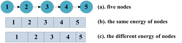 In Figure 3, the link is composed of five nodes, which is 1-2-3-4-5. Figure 3 expresses that the sum energy of nodes is same, but the energy value of each node is different. Network fairness and load balance can affect the rate of energy consumption of nodes, which can result in the difference of the residual energy value of the nodes in a certain link or region. If the sum of link energy is same, the link of Figure 3(b) is more stable than Figure 3(c), the network lifetime of