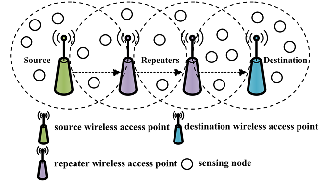 In the cognitive radio networks, nodes may need to communication with the other nodes which are beyond their ranges. As shown in Figure 1, if the source node transmits signal to the destination node that beyond its rang, it usually uses its neighbor node to receive and repeat the signal. The neighbor node is called a repeater node. Considering the different node position, the routing process may require multiple nodes forwarding or resending data to complete the transfer [12] . This end-to-end transmission process is shown in Figure 1.