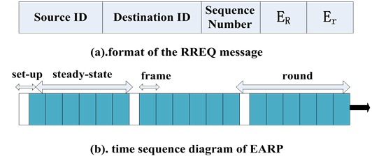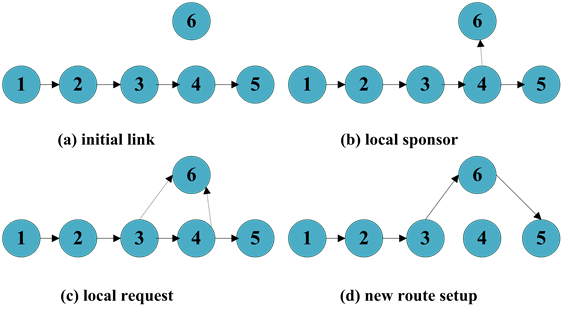 In Figure 6, the node 1-2-3-4-5 forms a complete transmission link, assuming that there is no one-way link in the network. In the process of data forwarding, the node 4 is unable to continue transmitting the data as its own residual energy value is too low. The EARP predicts that the energy is too low in advance and starts the local maintenance strategy. Node 4 sends RREQ information to its su- rrounding nodes, and its neighbor node 6 receives information. Node 6 finds its routing table can be used to replace the node 4 routing, and checks its own residual energy value. If the value of the node 6 is in conformity with the forwarding condition, it returns information to the node 4, and informs the node 4 of the upstream node 3, then the node 4 enters the wait state. This process is shown in Figure 6(c). Node 3 completes the work of routing selection, which includes the energy sufficient of link data transmission. It effectively avoids the routing data due to lack of the residual energy retransmitting, which is shown in Figure 6(d). Finally the new route setup is 1-2-3-6-5.