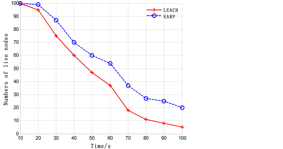 Network lifetime is usually described using survival of network of sensing nodes. The survival curve of sensing nodes for protocol is shown in Figure 8. As can be seen from Figure 8, the two network routing protocols are decreased continuously with the network node survival of network working hours. But at the same time point, the numbers of live nodes of the EARP are more than that of the LEACH.