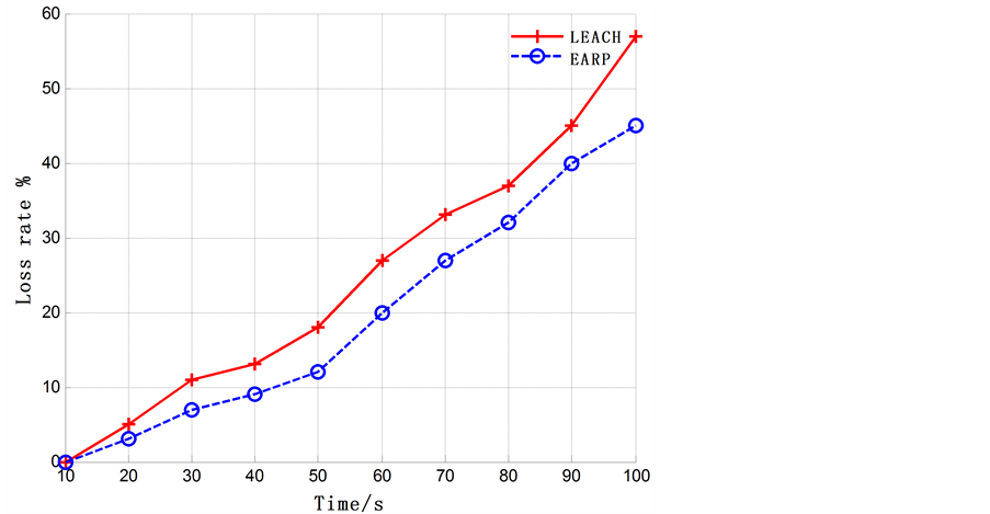 formance for CRNs. The packet loss rate curve of CRNs for this protocol is shown in Figure 9. As can be seen from Figure 9, with the increased run time of CRNs, the packet loss rate of sensing is rising, which is mainly because as the network time increases, the death rate of network node is increased. If the death of sensing node in data forwarding routing occurs, it may lead to failure in the established data forwarding routing. The sensing nodes no longer play the role of relaying the data, and the packet on the route would be lost. At the same time, comparing with the LEACH, the EARP in this paper has smaller packet loss rate, which is mainly because the routing protocol in this paper has introduced the energy aware mechanism, saving energy consumption, and ensuring the communication quality of the network, thereby improving the success rate of packet forwarding.
