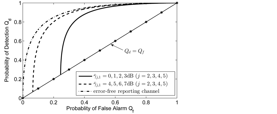 In Figure 2 we present the impacts of reporting channel errors on cooperative spectrum sensing performance by illustrating ROC curves of