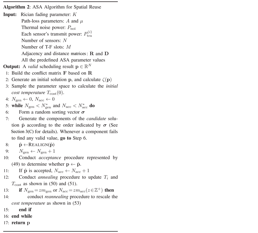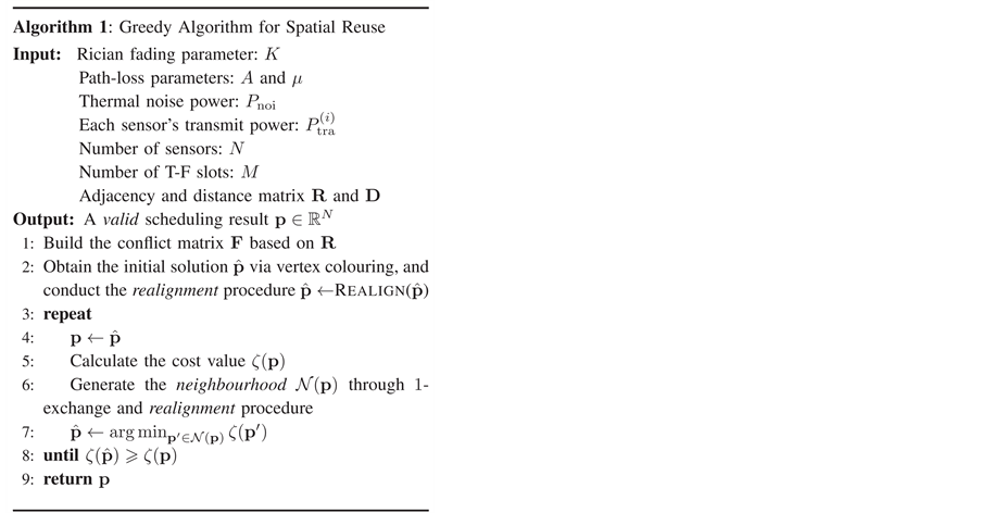 [26] reduces the number of required slots by dividing sensors into groups which can communicate simultaneously, employing spatial reuse for scheduling. The objective is to divide the N sensors into M separate sets, and assign one T-F slot to the sensors in the same set. The scheduling result is defined as an N-dimen- sional vector