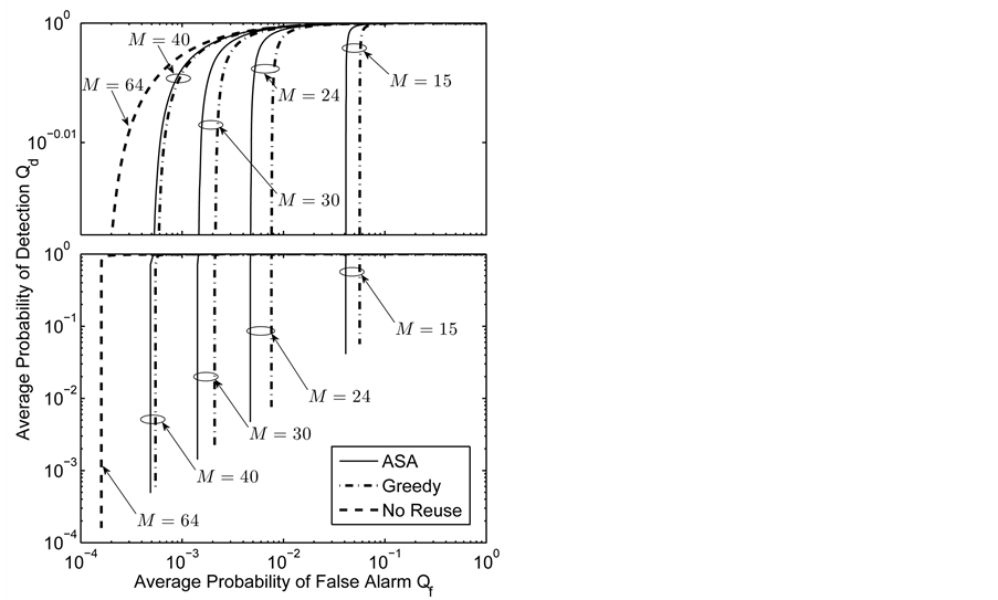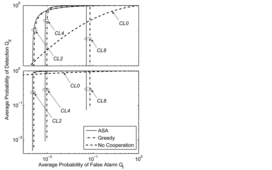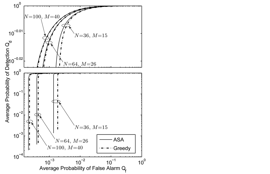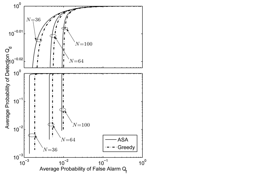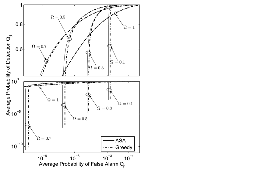 Numerical results for a grid network in Section 4 show how the spectrum sensing performance is influenced by system parameters, and also present a comparison of the ASA and greedy algorithms. The ROC curves in Figures 8-11 show that using the OR decision fusion rule, the difference between the curves of the two algorithms is very small in relatively high