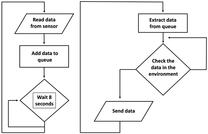 In WSN, software issues can be categorized into two headings. One of this is the computer software that will monitor the PIC sensor nodes and collect and record the data from sensor nodes, the other small embedded PIC operating system (software) that control and manages sensor nodes. All operations of sensor nodes are managed by the operating system and operating system which has been developed with PIC-C language. The developed PIC16F886 sensor node operating system was responsible to determine routing algorithm and MAC protocol, sending data retrieval, data processing, reading data from analog and digital sensors and memory management, communications between sensor nodes etc. For wireless communication, microcontroller software uses packet structure and the data stream is in bytes. If the network gets busy, data should wait in microcontroller’s memory for a while. In the system, data from the sensor and all the data from the other sensors are collected in a single queue. Each piece of data from the sensors is transferred to the queue as a byte. The data reading time of the sensors is made using timers in the software. The data is transferred to the queue by reading the sensors at specific time intervals. Data flows are controlled by cutting. The incoming data is transmitted to the queue for transmission via the cutting process. Diagram of data delivery system to other sensors or base station is shown in Figure 13. WSNs do not have any monitoring screen unit on the sensor nodes in many applications due to high cost and