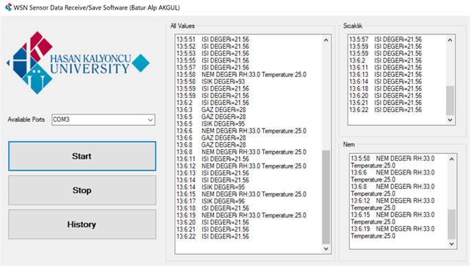 In this study, software has been developed on the Microsoft Visual Studio and C # language to monitor and save the data in the database with developed software, data could be observed and stored on a computer. Communication between computer observation software and wireless sensor nodes was carried out through RS232 to USB interface. Data collected from the network was stored for later processing purposes. Programmer’s software development and PIC coding skills and creativity move the technology in wireless networks forward. The designed receiver node uses the RS232 port for data transfer. This port is a wired communication port. When transmitter sensor nodes are completely wireless (including voltage requirements), the receiver node makes the data transfer wired. So, the cable dependency remains at WSN. Due to the receiver node is wired, it cannot be deployed away from the computer. Therefore, in the feature work, some attention has been given to the wireless transfer of data collected at the receiver node to the computer.