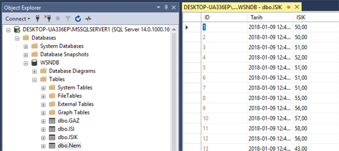 energy saving (in our designed sensor nodes, we have integrated LCD panel to check the results). But all the applications, the data needs to be displayed and recorded in the database, and obtained data could be observed and processed. In this study, an application on the Microsoft Visual Studio and C # language is developed to monitor and save the data in the database. The interface of the developed application and monitoring process is shown in Figure 14 and Figure 15 shows the SQL Databases with tables and stored data.