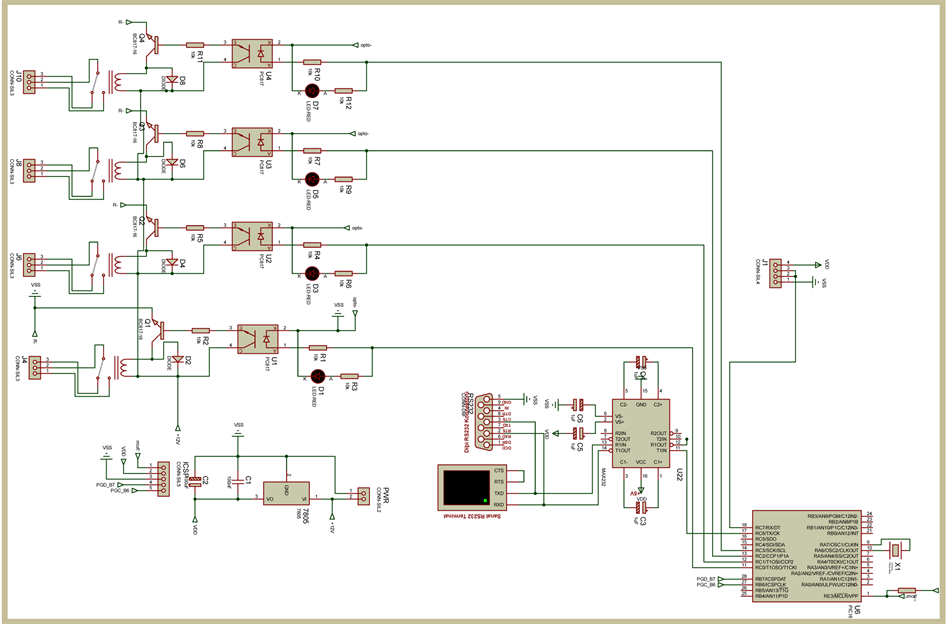 Four transmitters (master) nodes designed to monitor and examine the conditions of environment, one receiver sensor node (slave) designed to collect data and send to computer program via the RS232 port with relay unit. The communication module is an RF433 wireless transmitter unit with an antenna. Data and control unit includes a PIC microcontroller 16F886. Designed wireless sensor