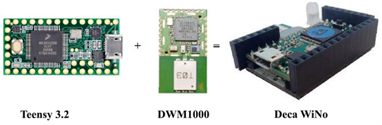 As we said earlier in this study, we will use DecaWiNo. This type of WiNo is composed of an Arduino board (Teensy 3.2) and the DecaWave DWM 1000 module with a UWB transceiver and an antenna. For node management, the DecaDuino library was developed by the RMESS team in the Arduino environment (Figure 6).