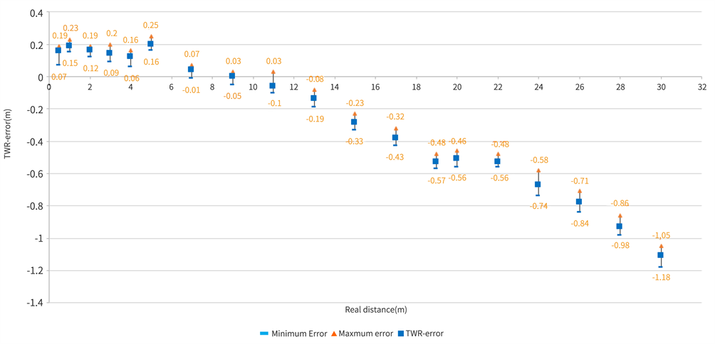 these absolute average errors evolve rapidly from 55 cm for a real distance of 13 meters to 1.35 m for a real distance of 30 meters, with extremums ranging from 53 cm to 1.43 m respectively. The SDS-TWR protocol always gives an underestimated value of the real distance.