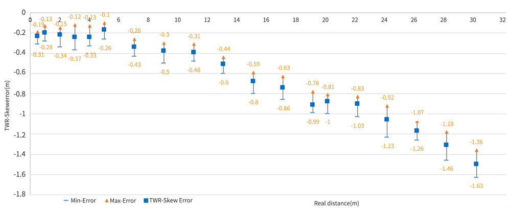 As for the TWR_Skew, we also note that for distances less than 13 meters the absolute errors (means and extremums) do not exceed 50 cm. Beyond 13 meters,
