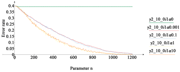 The influence of the parameter α on the training accuracy is shown in the curves given in Figure 4. The curves represent the results of calculations for the sample 2_10_0 with M = 1000, the index i1 and the five values α = 0, 0.001,