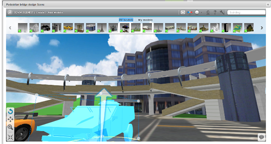 street furniture, and buildings as shown Figure 8. Planners and designers can simultaneously adjust the design within the virtual world, which is an amazing feature of 3DVIA’s cloud software service. In Figure 8, the user is locating a car. However, there are no programmable scenarios that can define the behaviors of cars like the function present in VR-Cloud. In 3DVIA, only the avatars representing real users will move around the virtual