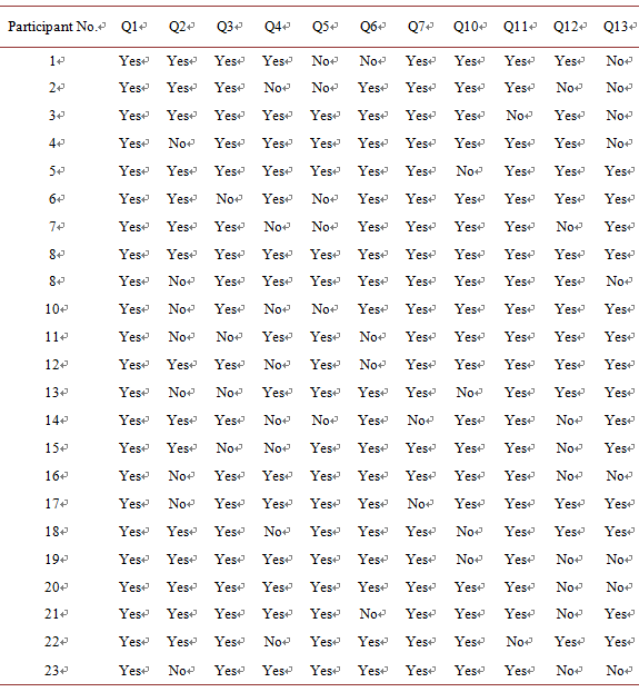 As shown in Appendix A, the questionnaire is composed of thirteen questions: eleven “Yes/No” questions and two fill in the blank questions. The results of eleven “Yes/No” questions of the questionnaire are summarized in Table 1, while Table 2 summarizes the two “fill in the blank” questions.