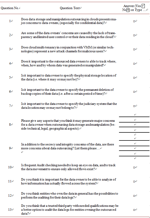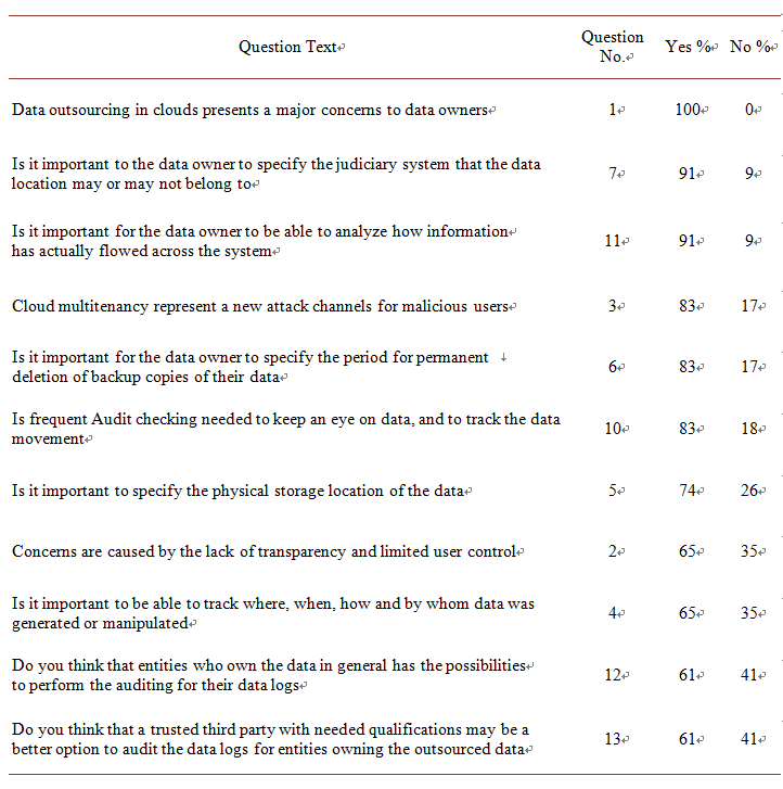 Results of the questionnaire showed that 100% of the sample believes that data outsourcing will generate major concerns (Q1); most of the concerns are directly related to data security, availability, and location. 91% of the sample believes that specifying a judiciary system and analyzing how information has flowed across the system are two major concerns (Q7 and Q11). Users’ ability to control their data, and the lack of CSPs’ transparency, were among the major concerns of data owners. About 83% of the sample believes that cloud multitenancy forms a new attach channel, it is important to