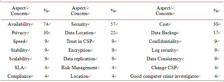 As for Table 2 (Q8 and Q9), we notice that the availability aspect constitutes 74% of the concerns, security constitutes 57% of the concerns, while cost and privacy share the same percentage amount; 30%. Regarding the terms, we believe that the diversity of backgrounds in the sample have led to use different terminology/terms when asked to write their major concerns listed in Table 2, but most of these concerns were focused on the data secrecy and protection. The CSPs service quality was listed by the data owners but was not considered major. Table 2 content is shown in Figure 3 to present the relation of percentages for the aspects concerns.