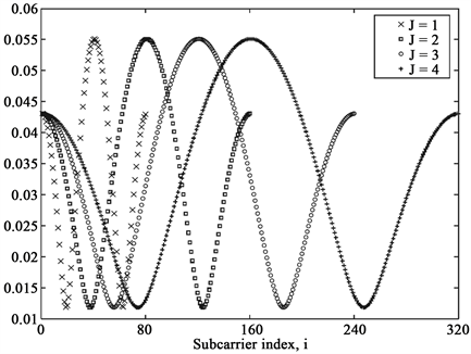 In order to verify the performance edge of the oversampled OFDM one tap equalizers, we consider a baseband OFDM system with the number of subcarriers N = 80, and J = 1, 2, 3, 4. The randomly generated input data were modulated by 4-ary Quadrature Amplitude Modulation (4-QAM) and the quasi-static Rayleigh fading channel was assumed to have taps (3-ray channel).The carrier frequency was set at 900 MHz and the Doppler frequency was fixed at MHz. This means that the vehicle was moving at a speed of 80 Km/h. In Figure 4, the frequency response of the channel shows deep amplitude fades of up to −40 dB. We assumed that channel sate information (CSI) was perfectly known to the receiver and the SER performance was averaged over 1000 independent runs for OFDM symbols.