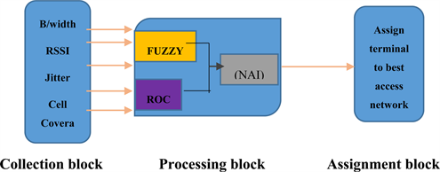 from the above equation is the defuzzified output and the aggregated membership function is the desired threshold . The only setback with this technique, as stated in [10] , is the difficulty associated with a case of complex membership function. The overall Fuzzy system designed for this work is represented in a functional block diagram having three main sections; the collection block, processing block and the assignment block as shown in Figure 3. The collection section basically listens and collects data for the attributes, to assess the impact of the network parameters on the network QoS. The processing block comprises of the Fuzzy inference system, the ROC and the network average index (NAI). The data stored from the collection block is processed by the fuzzy inference system while the ROC receives these data to classify the most adequate network in the environment. The mobile device is based on the weights of the parameters.