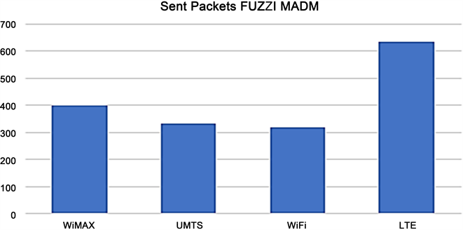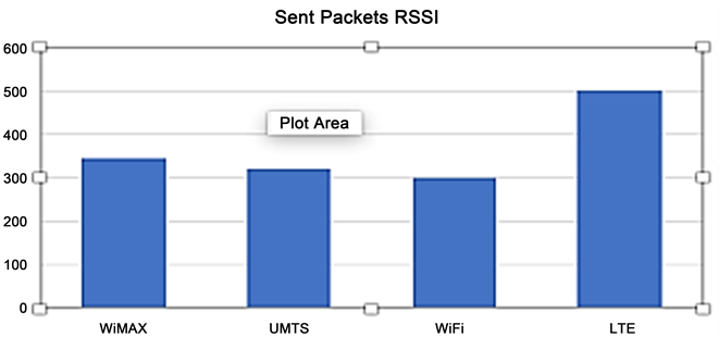 As shown in Figure 6, the average delay in WiMAX appears steady as compared to that exhibited by UMTS and Wi-Fi showing a maximum average end-to-end delay of approximately 0.9 seconds, which is less than the average delay in UMTS (<50%). From the simulation results, LTE and WiMAX network provides better VoIP services in terms of packet delay (end to end) which can be directly linked to their higher data rates and all-IP network type unlike UMTS which comprises of packet switched and circuit switched technologies. As shown in Figure 6, the LTE network has no delay. Besides its traditional characteristics of high data rates, another contributing factor to the perfect performance of LTE in this simulation include the choice of network design and the earlier assumptions made to reduce simulation complexity. In a UMTS network, VoIP call must go through a selection process to choose either the packet or circuit switched technology which adds to the overall end-to-end delay of the network. The back-off delay, as earlier mentioned, prevents the ping-pong effect. With the same network selection mechanism applied to all users, it is expected that in situations where one access network is particularly excellent, all the users will try to handover to that network within a short interval. Depending on the link capacity availability, link quality will drop considerably and again, users will be forced to perform handover. A means of arriving at or computing this back-off delay is to estimate the benefits of handing over to preferred network compared to staying on the serving network. According to [20] , the bigger this quality difference, the lesser the delay. Figure 7 is a chart showing the sent packets network statistics for the different access technologies employed in the implementation of the HetNet.