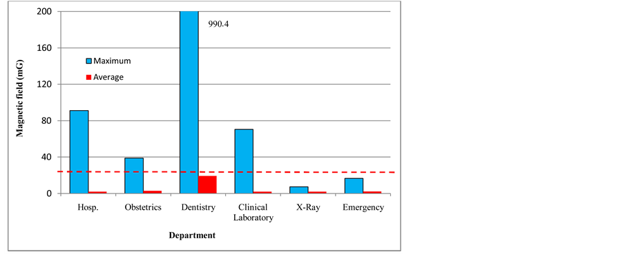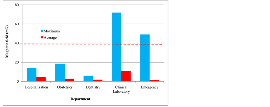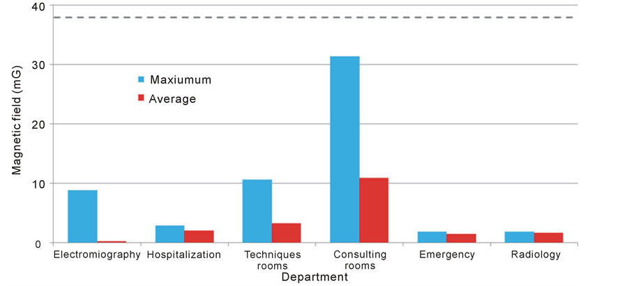 Table 4 shows the minimum, maximum and average magnetic field values at low frequency measured in the different departments of Hospital San Javier. Figure 22 shows the maximum and average values compared with the immunity level established by the IEC standard.