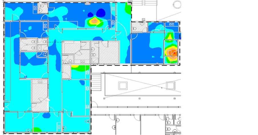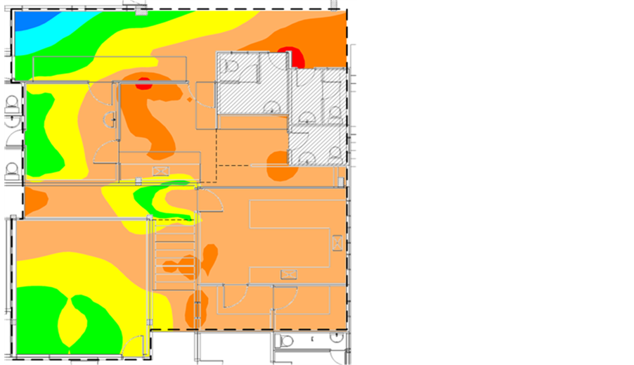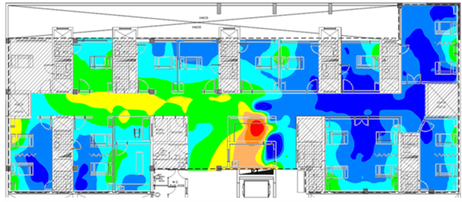According to the measurement results, the immunity level was surpassed in the clinical laboratory and in the obstetrics, dentistry and hospitalization sections of this hospital. Figure 23 shows the contour map of the magnetic field measured in the hospitalization section, plant 3. One area where the reference level is surpassed (indicated in red) can be observed. The high levels in this area are due to the presence of a communication system placed at the nurses’ station.