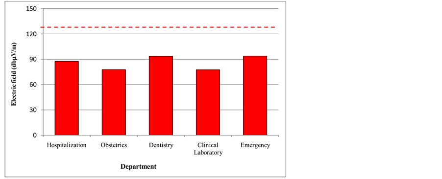 Table 5 presents the maximum electric field values measured in each department of Hospital San Javier. Figure 25 shows these values compared with the immunity level established by the IEC standard. In all the de-