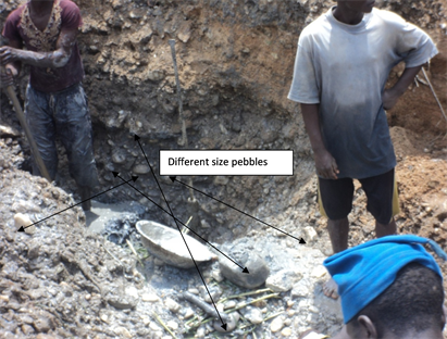 In 12 gold pits, each horizon located above the basal schist layer was described and the thickness measured using a metric tape. Different sizes of pebbles were equally collected from each horizon and labeled for the calculation of their aspect ratios.