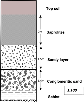 composed of a 30 to 50 cm organic topsoil layer, underlain by a 2 m thick saprolitic horizon, which is underlain by 1.5 m sandy section. The quartz dominated gravelly layer with an average thickness of 1.4 m overlies the biotite-mica schists of the paleo-Proterozoic basement, and consists of boulders (275 mm), cobbles and pebbles (28 - 38 mm) mixed with sand (0.9 - 1.5 mm) and silt (0.05 - 0.06 mm).