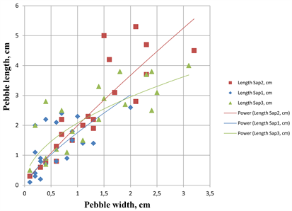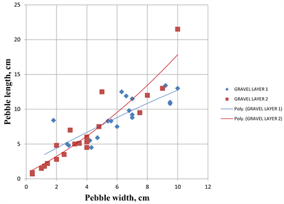 The second trend will correspond to sieves and classifiers of bigger diameter sizes (4.5 cm and 10 cm) for both sandy and gravelly horizons. The general relation between the pebble length (y) and width (x) is given by the polynomial trend relationships from which the diameter of the sieves derives.