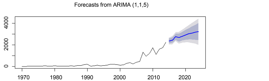 Table 5. R output of ARIMA (1, 1, 5) forecasts for the next 10 years.
