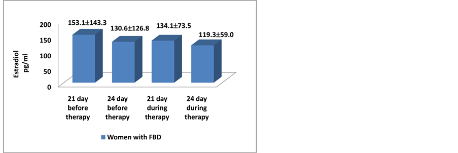 Fibrocystic breast disease (FBD) is a condition with high incidence in women during the reproductive age [1] . The incidence of benign breast disease within a population is 13.5% to 42% [2] . The hormonal changes, predominantly in estradiol and progesterone, as well as growth factors like the epidermal growth factor (EGF) and tissue growth factor α (TGFα) are the key factors in understanding the development and etiology of FBD. It is believed that higher concentrations of estradiol and lower concentration of progesterone in the midluteal phase, their disbalance and changed ratio can be the key factor in etiology of FBD [3] . Literature data are not consistant about these changes and further studies are needed. Having in mind the incidence of fibrocystic breast disease, detection of sex hormone in more details is very important. Nevertheless, relative hyperestrogenia and hypoprogesteronaemia, as well as changed estradiol/progesterone (E2/P) ratio, encouraged some researchers to base the therapeutic approach on the use of progesterone preparations. Recently, there was more data about exogenous natural progesterone and synthetic selective progesterone that they do not stimulate cell proliferation [4] , decrease number and expression of the estrogen receptors, or in the other words have anti estrogen effect [5] [6] . Progesterone used in a form of gel acts locally on the epithelium and breast vessels. Due to solubility characteristics, progesterone gel has effects on the site of applications and doesn’t have a systemic effect. It results in increase of 17-β-hydroxysteroid dehydrogenase which is the most important factor in estradiol metabolism. Adding progesterone there is short-term increase in differentiation and proliferation of epithelial tissue within the first 24 hours followed by a strong inhibition [7] - [9] . Progesterone antiproliferative effect on epithelial breast cells depends on kind of preparation and way of using, dose and duration of its administration [10] . There are no consistant data in the literature about the effects of oral contraceptive (OC) on benign breast disease. The low estrogen dose within combined OC, lower than 50 mcg reduces the risk of atypical fibroadenoma [11] . A majority of studies examining estradiol and progesterone detected only on the 21st day of the cycle, coming to conclusion that cycle is ovulatory and there were no hormonal changes. During the luteal phase, the most prominent changes are from day 21st-24th and minimum of data have to be completed with detection estradiol and progesterone in these days. The objective of this study was to examine changes of E2/P ratio on days 21st and 24th, and compared it with the ratio during therapy with progesterone gel.