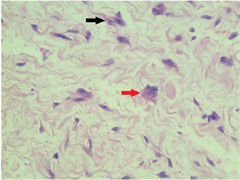 Figure 2. Fibroepithelial polyp. HE 40×. (a) Epithelial surface exhibiting stratified, squamous epithelium, with fibroelastic, edematous myxoid and hypocellular stroma. HE 20×; (b) Myxoid stroma with bland stellate cells (black arrow) and multinucleated stromal giant cells (red arrow).