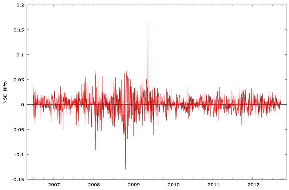 Table 1 of Panel A provides a summary of statistics of the stock return series. The significance of all the normality tests applied (in Panel B) indicated that the residuals appear to be leptokurtic. Further, the significant Ljung-Box statistics for the returns, Q(5) and squared returns, Q(10), indicating the rejection of the null of white noise, asserting that these return series are auto-correlated. In summary, it is clear that the Indian stock market exhibits frequent volatilities with extensive amplitude (which is also apparent in Figure 1), implying the assumption of normal distribution may not be suitable for capturing asymmetry and tail-fatness in a return distribution. Finally, unit root and stationary results reported in Panel C of Table 1 indicate that return series is stationary.