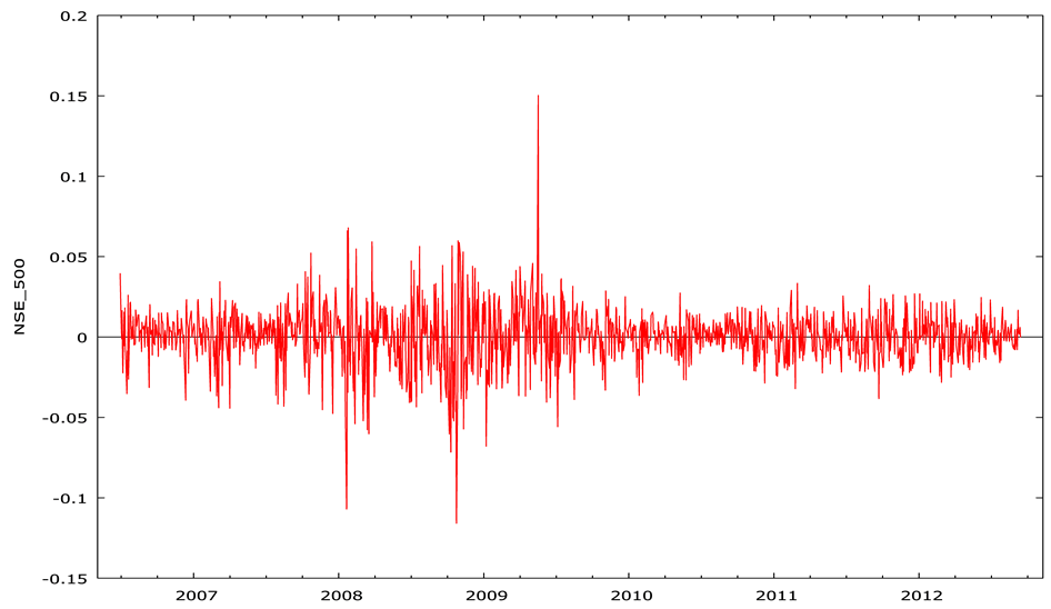 The data set used in this study comprises daily observations of NSE_Nifty and NSE_500 of India over the period 2006-06-29 to 2012-09-13, a total of 1545 observations. The daily stock returns are defined as the logarithmic first-difference of the daily closing index values. The data is extracted from the official website of reserve bank of India. We begin with descriptive statistics and stationarity analysis and presented first results in Table 1.
