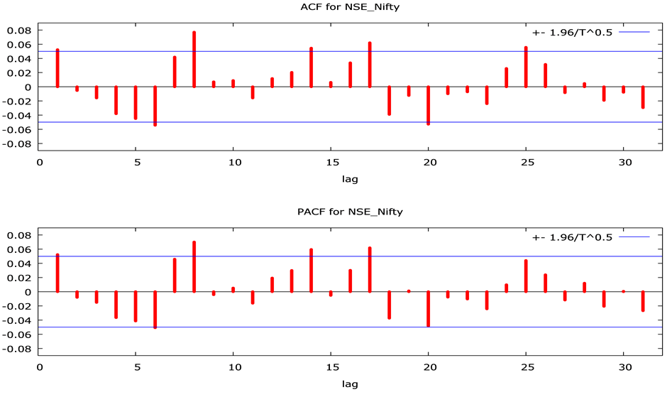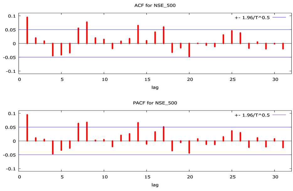 Figure 3. Autocorrelation and partial autocorrelation function for NSE_Nifty and NSE_500.
