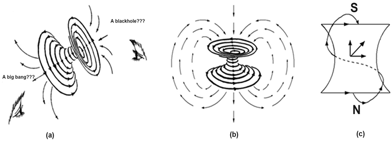 Figure 1. (a) Eddy motion model of the general system; (b) The meridian field of the yoyo model; (c) The typical trajectory of how matters return