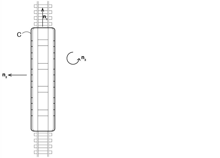 Next, consider an overhead view of a typical car C of the train as in Figure 5. Let the unit vectors be fixed relative to the car, with