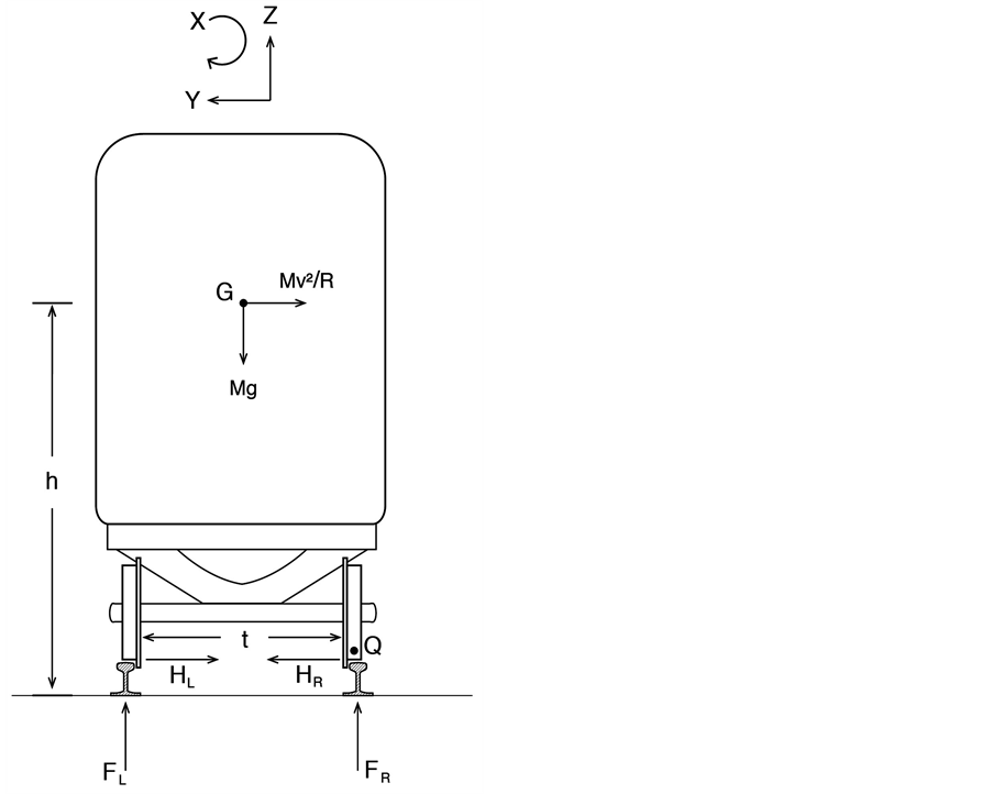 In the figure, if derailment is to occur, the rail-car will tend to rotate about the right side rail at point Q. When that occurs the left side rail forces become zero. Then by setting moments about Q equal to zero we obtain