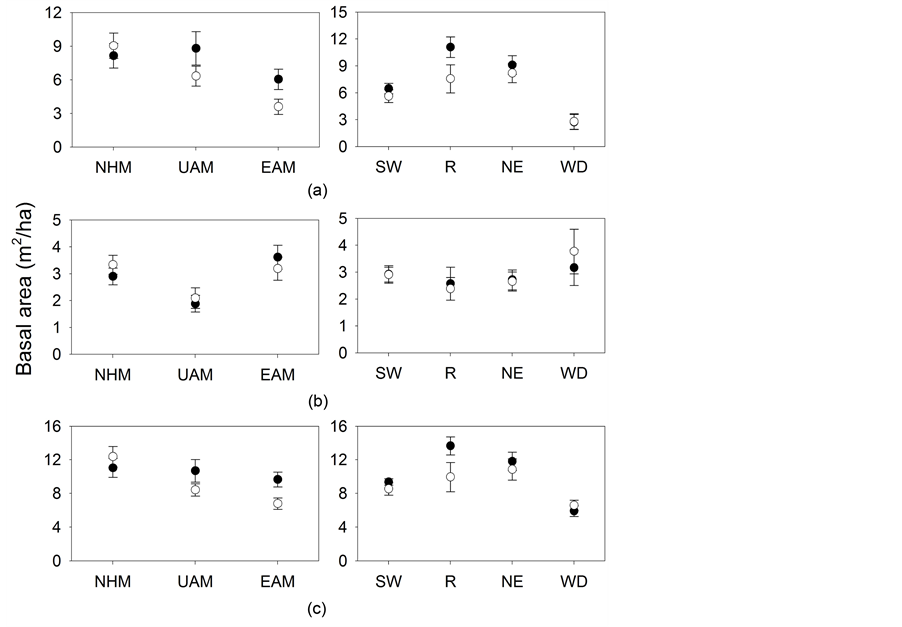 acorn yield under active management (combination of EAM and UAM) than NHM (Table 2). Declines in production coincided with decreases in the basal area of red oak species in actively managed sites shortly after treatment (Figure 5(a)). Post-treatment acorn production by red oak species and all oak species was highest on northeast side slopes and comparable among the three other landscape positions (Figure 4). Declines in acorn production on SW, R, and NE positions between pre- and post-treatment periods coincided with reductions in basal area of similar magnitude.