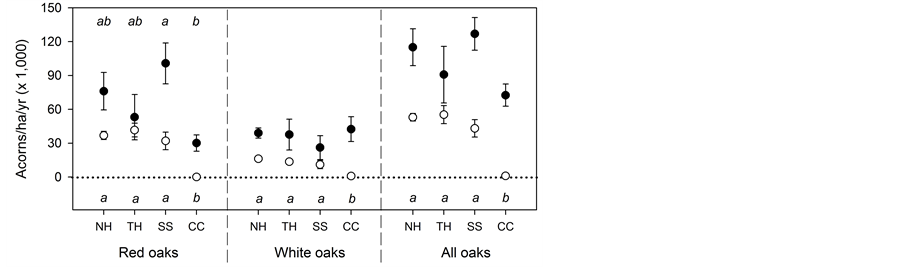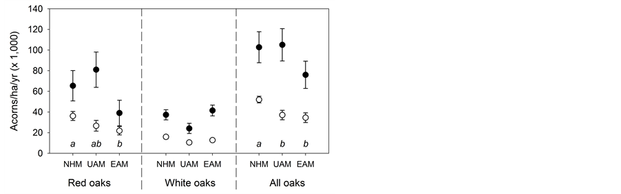 Figure 3. Mean annual production of mature, sound acorns (±1 standard error) by red oaks, white oaks, and all oaks within three forest management systems, averaged over ecological land types, captured before (1993-1995; black circles) and after (1997-2010; white circles) initiating forest management systems of the MOFEP experiment. Means followed by the same italicized letter within a species group are not statistically different based on Fisher’s protected least significant difference (α = 0.05). The bottom row of letters applies to post-treatment means only.
