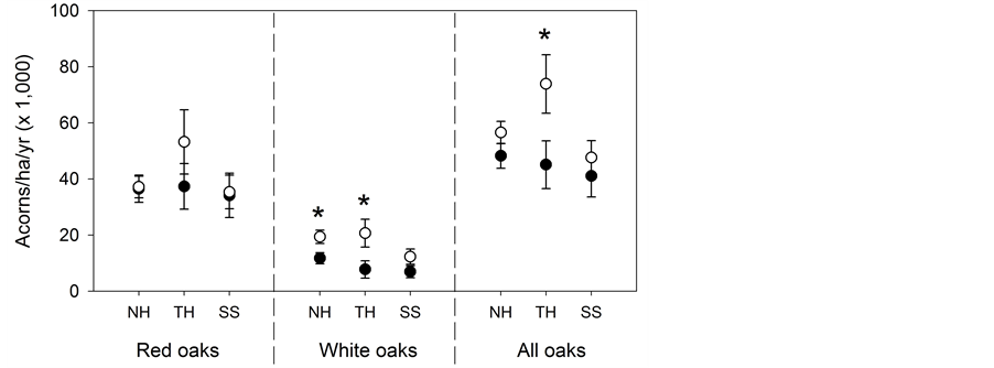 plots. White oak acorn production during the post-treatment period varied from a low of zero acorns collected in 2007 under UAM to a high of 61,000 acorns/ha under EAM in 2005. There were several years with no red oak or white oak acorns collected and very small crops of all oak species (Figure 2(c)). However, there was no year that acorns were not collected.