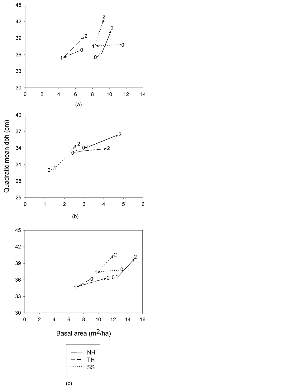 For red oak species (Figure 8(a)) within hard mast plots, SS produced an immediate reduction mainly in basal area and had less of an impact on quadratic mean diameter, whereas TH reduced both basal area and quadratic mean diameter. There was no immediate reduction in either basal area or quadratic mean diameter of white oak (dbh ≥ 25.4 cm) in either SS or TH stands (Figure 8(b)). Collectively, these patterns suggest that both partial cutting treatments targeted the removal of mainly red oak species, that this removal was more equable across the range of tree diameters in SS stands, and that the TH targeted larger red oaks. By 2010, the basal area of red oak species rebounded in TH stands, slightly exceeding pre-treatment basal area, while red oak basal area in SS stands rebounded marginally. Basal area of white oak species also showed a larger increase in TH stands compared to SS stands from 1998-2010. However, quadratic mean diameter of both red oak species and white oak species exhibited larger increases after SS than TH during the post-treatment period.